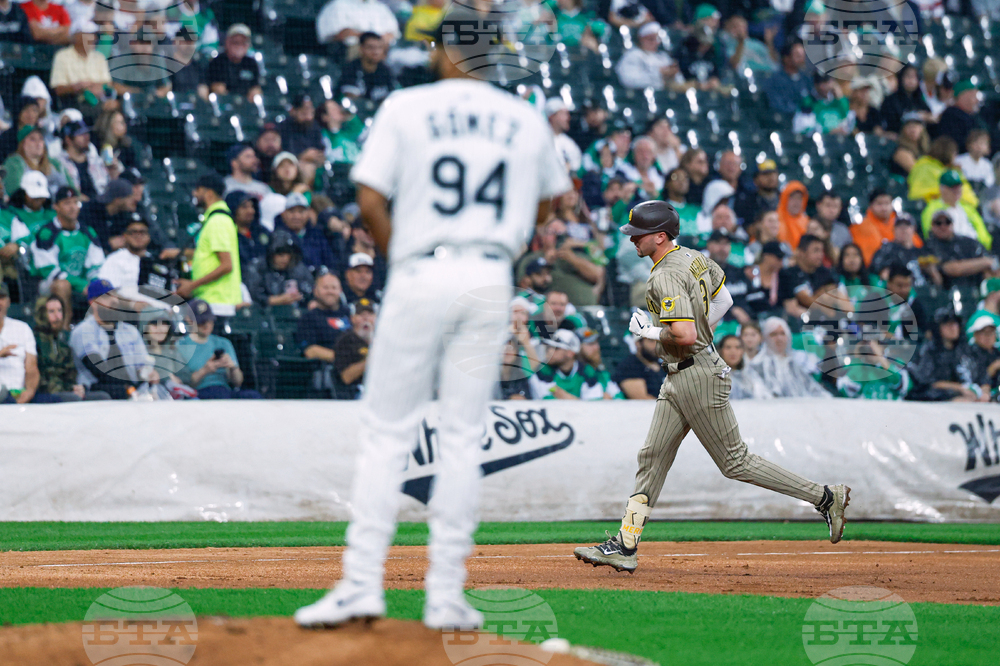 San Diego Padres' Jackson Merrill, right, rounds the bases after hitting a solo home run against the Chicago White Sox during the second inning of a baseball game, Saturday, Sept. 20, 2025, in Chicago. (AP Photo/Kamil Krzaczynski)