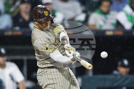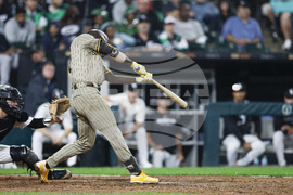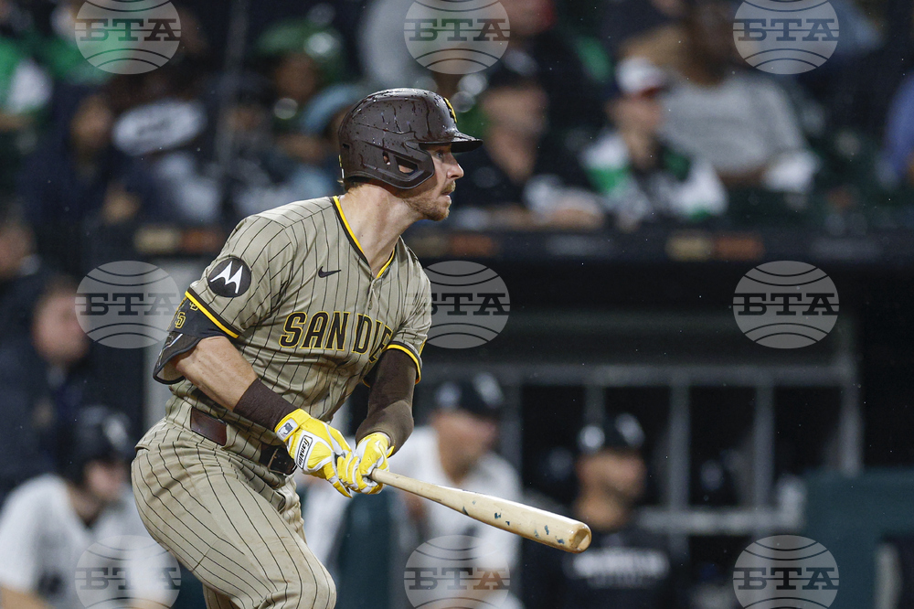 San Diego Padres' Luis Arraez hits an RBI single during the third inning of a baseball game against the Chicago White Sox, Friday, Sept. 19, 2025, in Chicago. (AP Photo/Matt Marton)