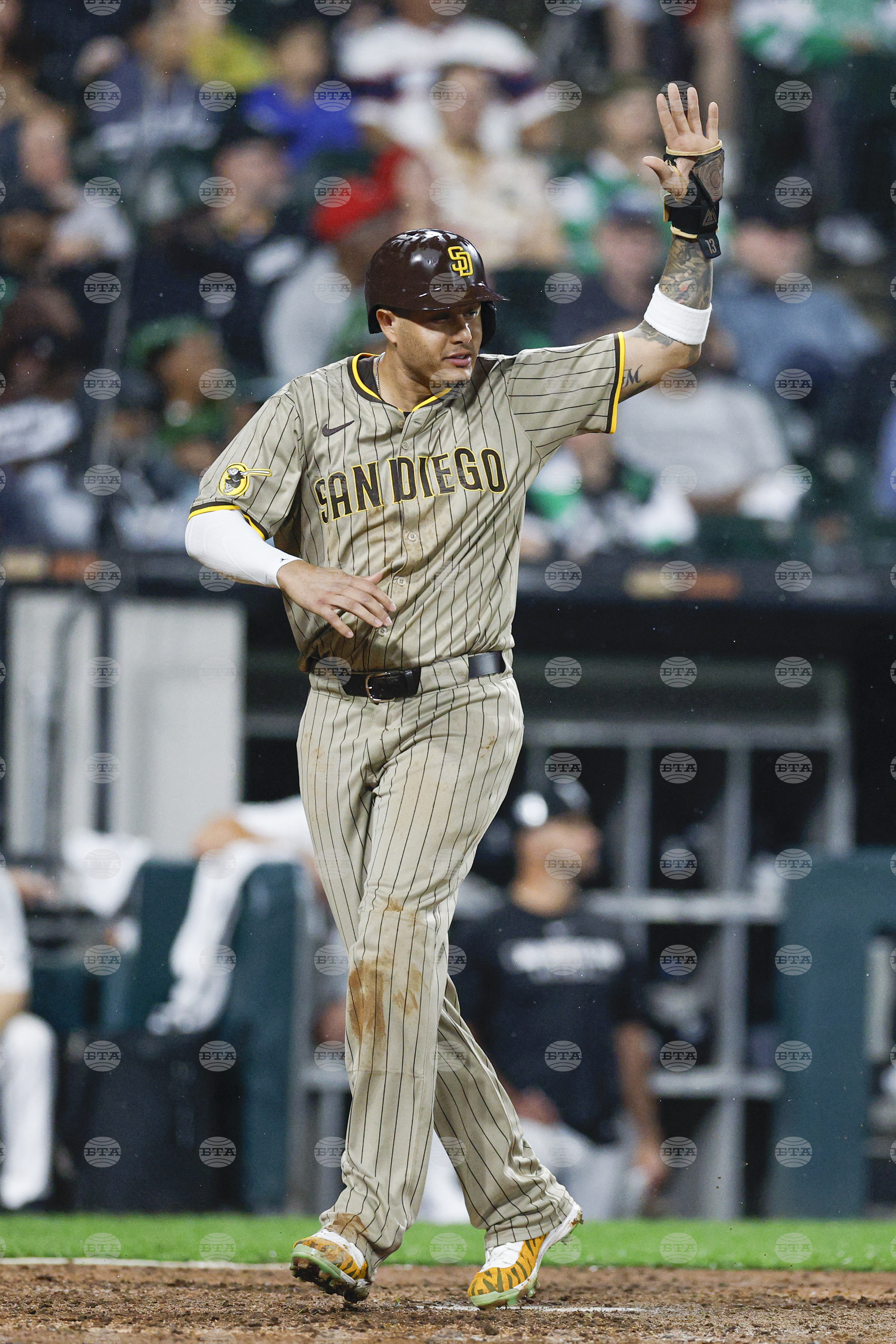 San Diego Padres' Manny Machado scores on a double hit by San Diego Padres' Ryan O'Hearn against the Chicago White Sox during the sixth inning of a baseball game, Saturday, Sept. 20, 2025, in Chicago. (AP Photo/Kamil Krzaczynski)
