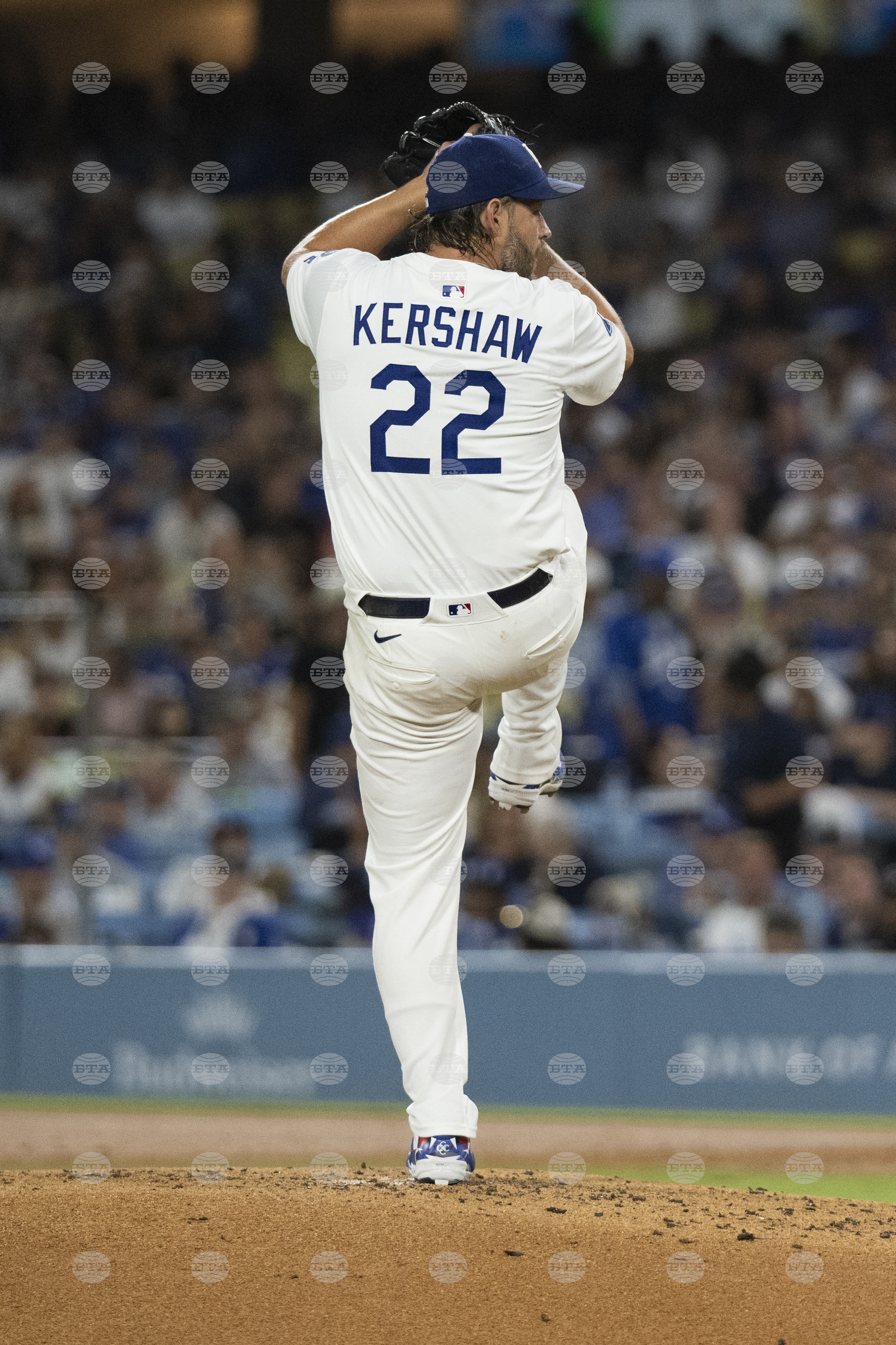 Los Angeles Dodgers starting pitcher Clayton Kershaw (22) fixes his pants during the second inning of a baseball game against the San Francisco Giants in Los Angeles, Friday, Sept. 19, 2025. (AP Photo/Kyusung Gong)