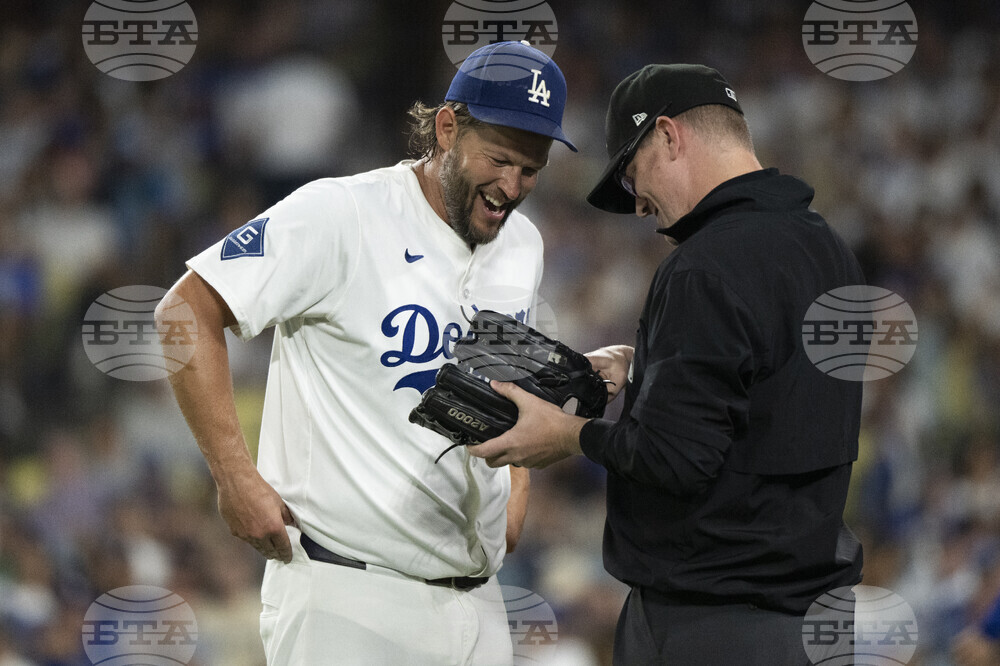 Los Angeles Dodgers starting pitcher Clayton Kershaw, left, gets his glove checked by an umpire during the fourth inning of a baseball game against the San Francisco Giants in Los Angeles, Friday, Sept. 19, 2025. (AP Photo/Kyusung Gong)