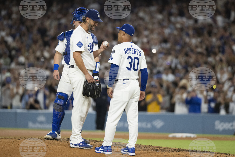 Los Angeles Dodgers starting pitcher Clayton Kershaw, left, smiles as manager Dave Roberts (30) removes him during the fifth inning of a baseball game against the San Francisco Giants in Los Angeles, Friday, Sept. 19, 2025. (AP Photo/Kyusung Gong)