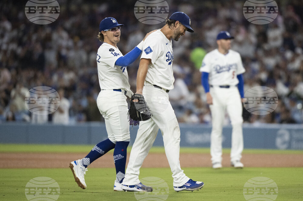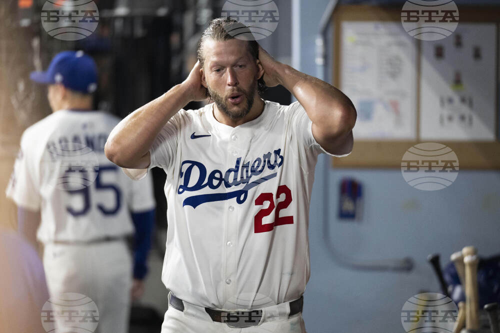 Los Angeles Dodgers starting pitcher Clayton Kershaw, center, reacts after being removed during the fifth inning of a baseball game against the San Francisco Giants, in Los Angeles, Friday, Sept. 19, 2025. (AP Photo/Kyusung Gong)