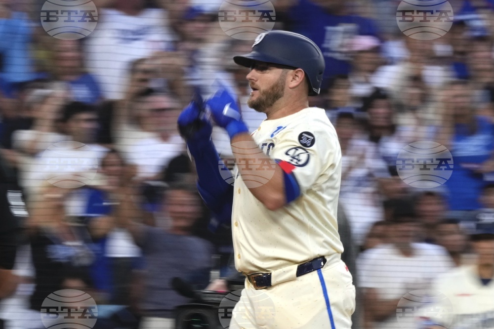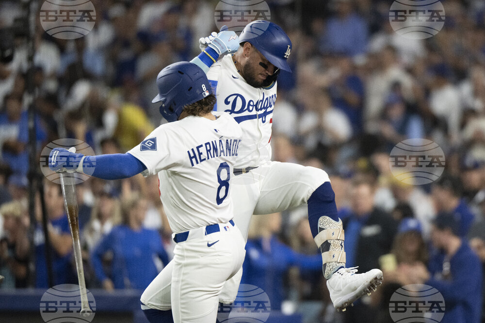 Los Angeles Dodgers' Tommy Edman is congratulated by Teoscar Hernández after hitting a solo home run during the fifth inning of a baseball game against the San Francisco Giants, Saturday, Sept. 20, 2025, in Los Angeles. (AP Photo/Mark J. Terrill)