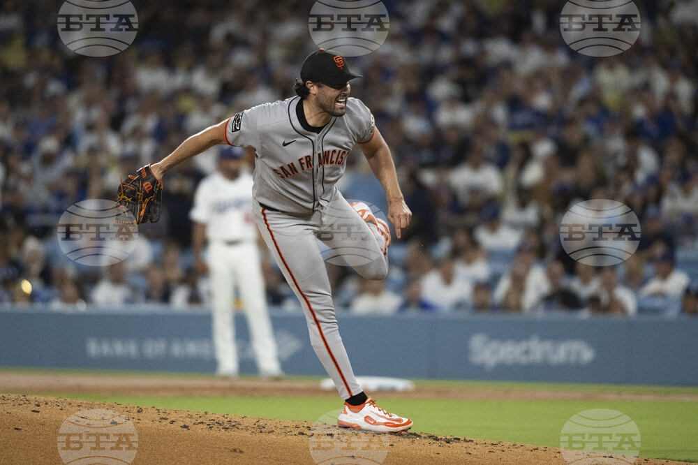 San Francisco Giants starting pitcher Robbie Ray delivers during the first inning of a baseball game against the Los Angeles Dodgers in Los Angeles, Friday, Sept. 19, 2025. (AP Photo/Kyusung Gong)