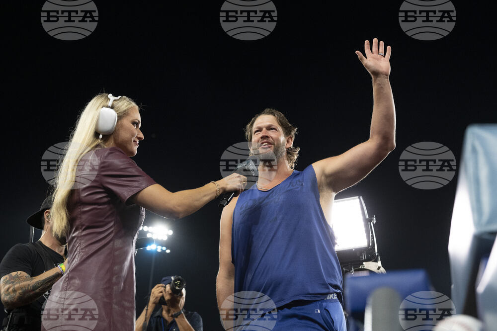 Los Angeles Dodgers' Clayton Kershaw, right, waves towards the stands after the team defeated San Francisco Giants in a baseball game in Los Angeles, Friday, Sept. 19, 2025. (AP Photo/Kyusung Gong)