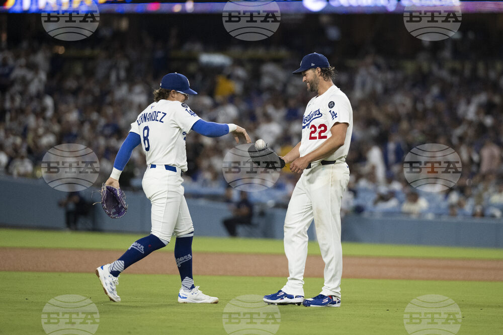 Los Angeles Dodgers third baseman Kiké Hernández, left, tosses the ball to starting pitcher Clayton Kershaw during the fifth inning of a baseball game in Los Angeles, Friday, Sept. 19, 2025. (AP Photo/Kyusung Gong)