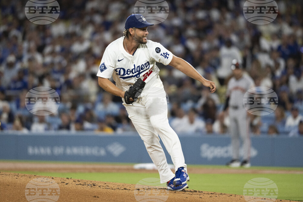 Los Angeles Dodgers starting pitcher Clayton Kershaw delivers during the first inning of a baseball game against the San Francisco Giants, in Los Angeles, Friday, Sept. 19, 2025. (AP Photo/Kyusung Gong)