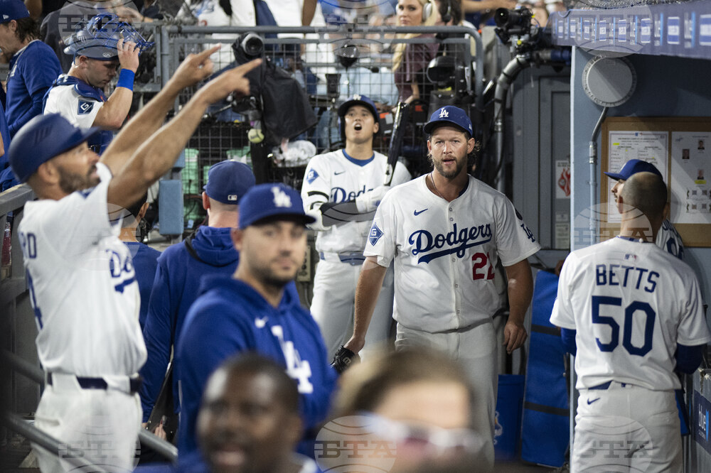Los Angeles Dodgers starting pitcher Clayton Kershaw (22) talks to his teammates as he is being removed from the game during the fifth inning of a baseball game against the San Francisco Giants in Los Angeles, Friday, Sept. 19, 2025. (AP Photo/Kyusung Gong)