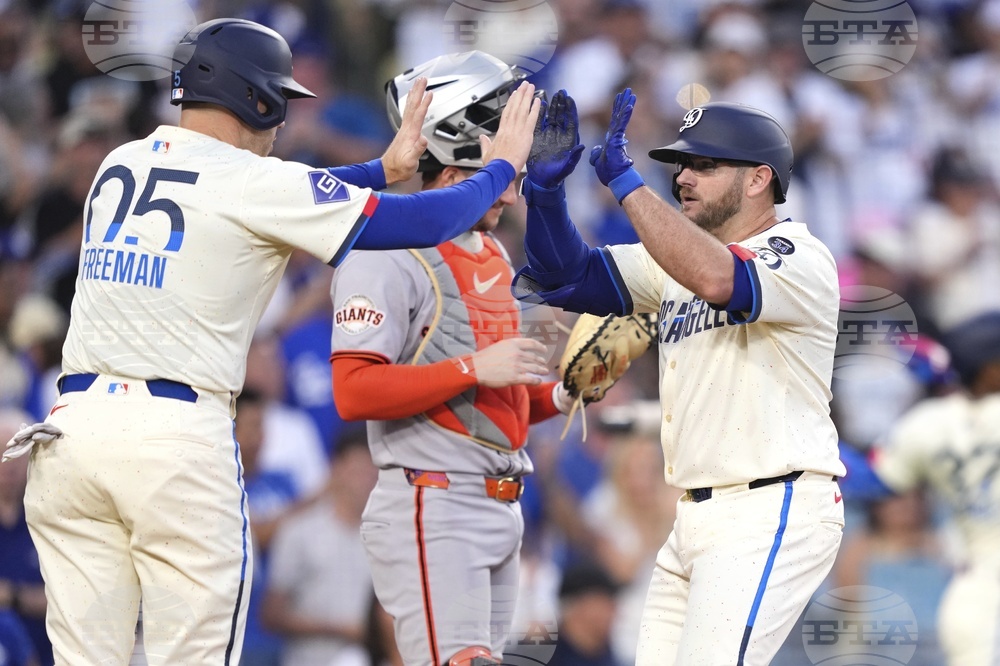 Los Angeles Dodgers' Max Muncy is congratulated by Freddie Freeman, left, after hitting a two-run home run as San Francisco Giants catcher Patrick Bailey stands by during the first inning of a baseball game Saturday, Sept. 20, 2025, in Los Angeles. (AP Photo/Mark J. Terrill)