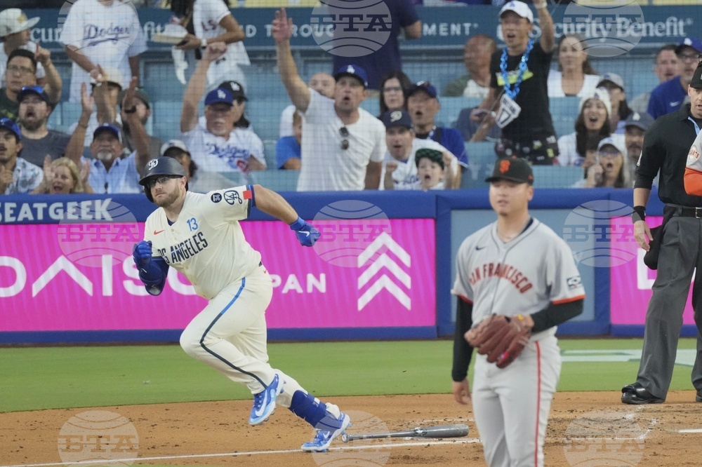 Los Angeles Dodgers' Max Muncy hits a two-run home run during the first inning of a baseball game against the San Francisco Giants, Saturday, Sept. 20, 2025, in Los Angeles. (AP Photo/Mark J. Terrill)