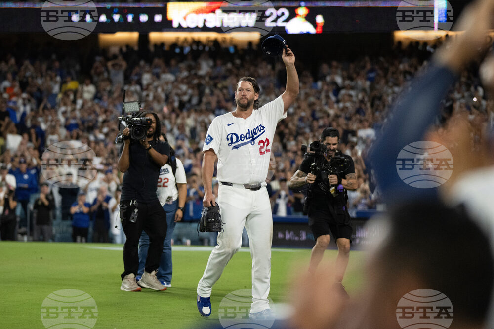 CORRECTS FROM FOURTH INNING TO FIFTH - Los Angeles Dodgers starting pitcher Clayton Kershaw (22) tips his cap after being removed during the fifth inning of a baseball game against the San Francisco Giants in Los Angeles, Friday, Sept. 19, 2025. (AP Photo/Kyusung Gong)