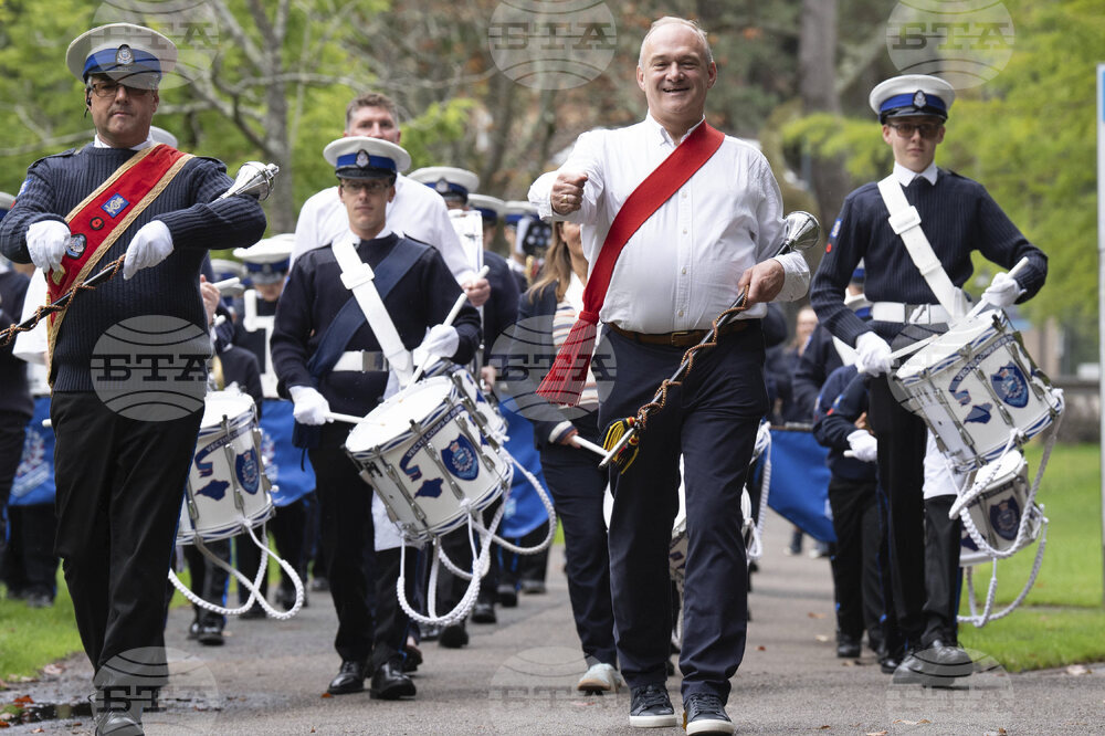 Britain's Liberal Democrats leader Ed Davey, center, marches at the Liberal Democrats autumn conference, at the Bournemouth Conference Centre with members of the Vectis Corps of Drums, in Dorset, England, Saturday, Sept. 20, 2025. (Stefan Rousseau/PA via AP)