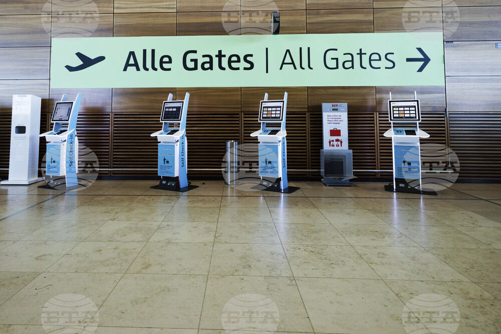 Check-in counters at a terminal at Berlin's Brandenburg airport, in Schönefeld, Germany, Saturday Sept. 20, 2025, after a cyberattack targeting check-in and boarding systems disrupted air traffic at several major European airports. (Carsten Koall/dpa via AP)