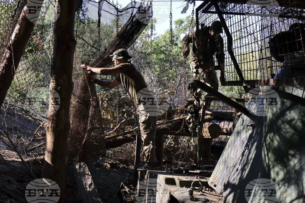 In this photo provided by Ukraine's 65th Mechanized Brigade on Saturday, Sept. 20, 2025, Ukrainian soldiers camouflage artillery vehicle after firing toward Russian positions at the frontline in Zaporizhzhia region, Ukraine. (Andriy Andriyenko/Ukraine's 65th Mechanized Brigade via AP)
