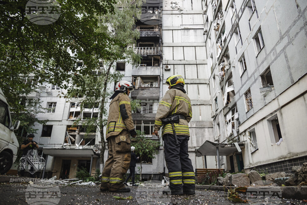 In this photo provided by Dnipropetrovsk military regional administration on Saturday, Sept. 20, 2025, Rescue workers stand in front of a residential building damaged after a Russian strike on Dnipro, Ukraine. (Dnipropetrovsk military regional administration via AP)