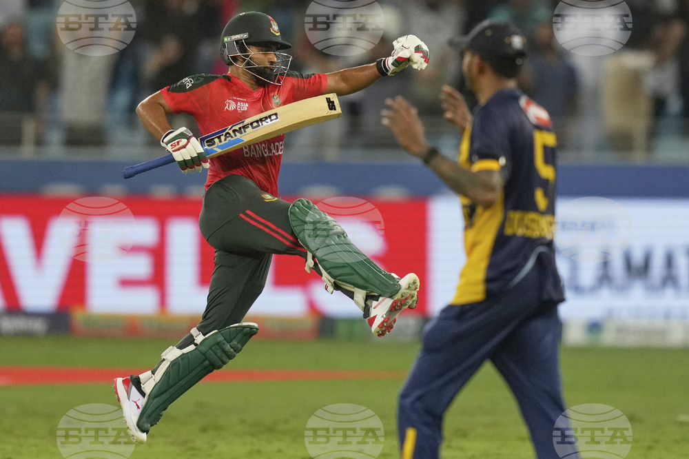 Bangladesh's Shamim Hossain jumps to celebrate after their win against Sri Lanka in the Asia Cup cricket match at Dubai International Cricket Stadium in Dubai, United Arab Emirates, Saturday, Sept. 20, 2025. (AP Photo/Altaf Qadri)