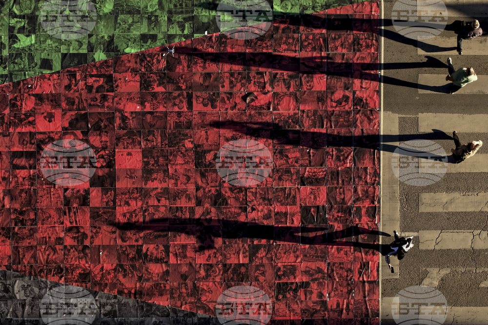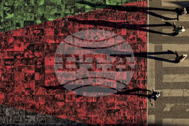 An aerial view shows people marching next to the Palestinian flag made of photographs of people killed, displayed on a street during a protest in support of Palestinians in Hadzici, suburb of Sarajevo, Bosnia, Saturday, Sept. 20, 2025. (AP Photo/Armin Durgut)