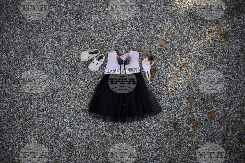 Girls clothes, shoes and a toy are set on the ground as part of a memorial for the killed Palestinians, during a protest in Hadzici suburb of Sarajevo, Saturday, Sept. 20, 2025. (AP Photo/Armin Durgut)