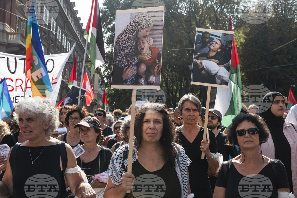 People demonstrate against genocide and in support of Palestinian people in Turin, Italy on Saturday, Sept. 20, 2025. (Matteo Secci/LaPresse via AP)