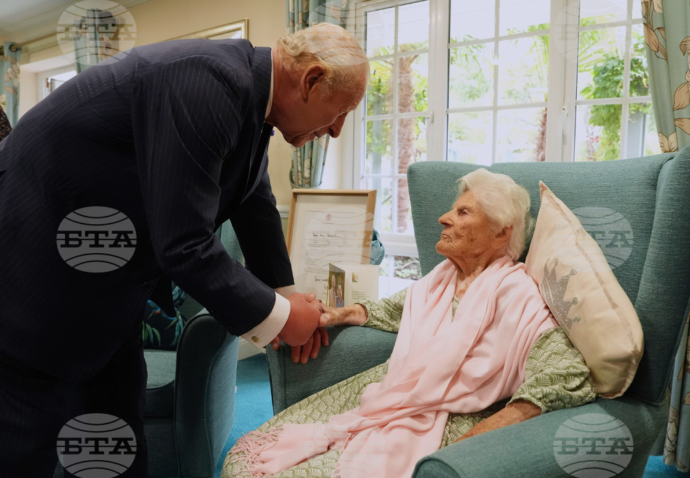 Britain's King Charles III meets the world's oldest person, 116-year-old Ethel Caterham, at Hallmark Lakeview Care Home in Lightwater, England, Thursday, Sept. 18, 2025. (Jonathan Brady/PA via AP)