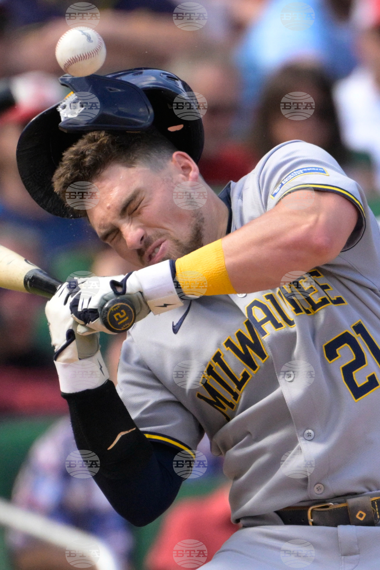 Milwaukee Brewers' Caleb Durbin is hit by a pitch during the sixth inning of a baseball game against the St. Louis Cardinals, Sunday, Sept. 21, 2025, in St. Louis. (AP Photo/Jeff Le)
