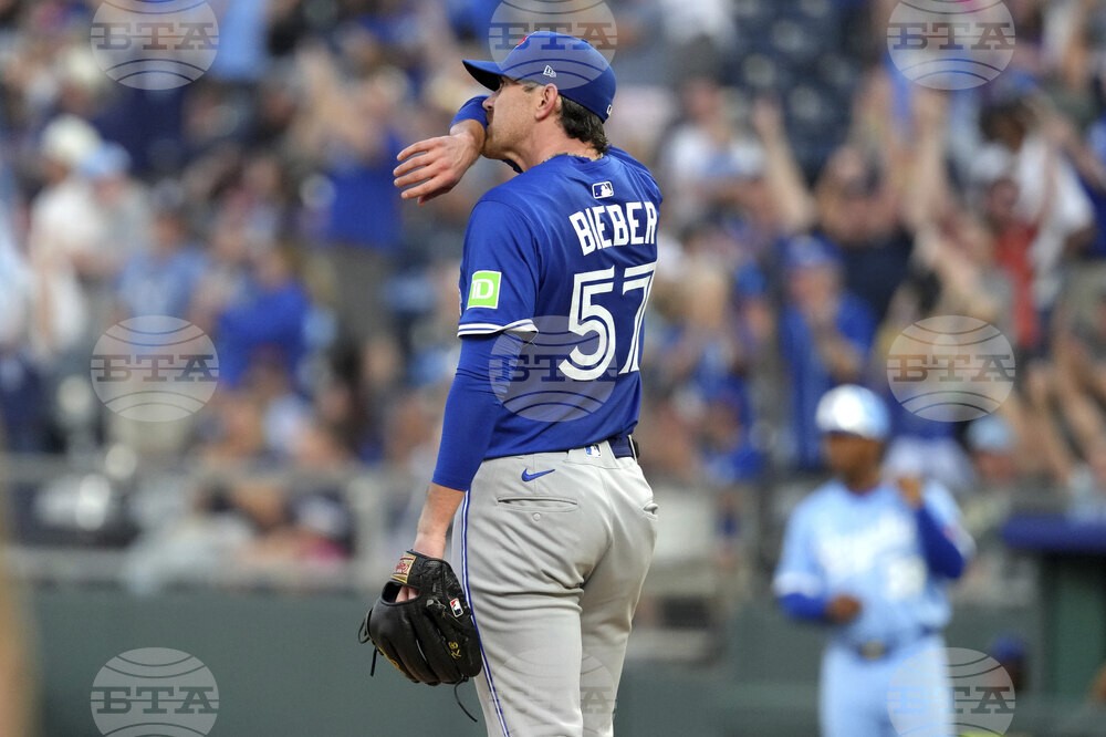 Toronto Blue Jays starting pitcher Shane Bieber wipes his face after giving up a home run to Kansas City Royals' Vinnie Pasquantino in the fourth inning during a baseball game Saturday Sept. 20, 2025, in Kansas City, Mo. (AP Photo/Ed Zurga)