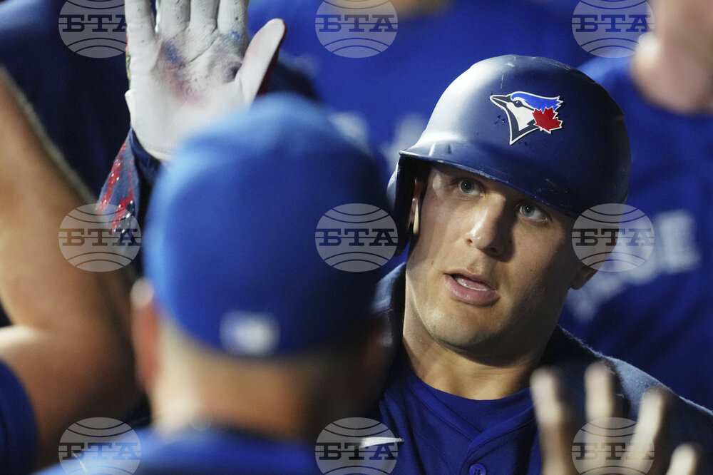 Toronto Blue Jays' Myles Straw celebrates in the dugout after scoring on an RBI single hit by Ernie Clement during the eighth inning of a baseball game against the Kansas City Royals, Sunday, Sept. 21, 2025, in Kansas City, Mo. (AP Photo/Charlie Riedel)