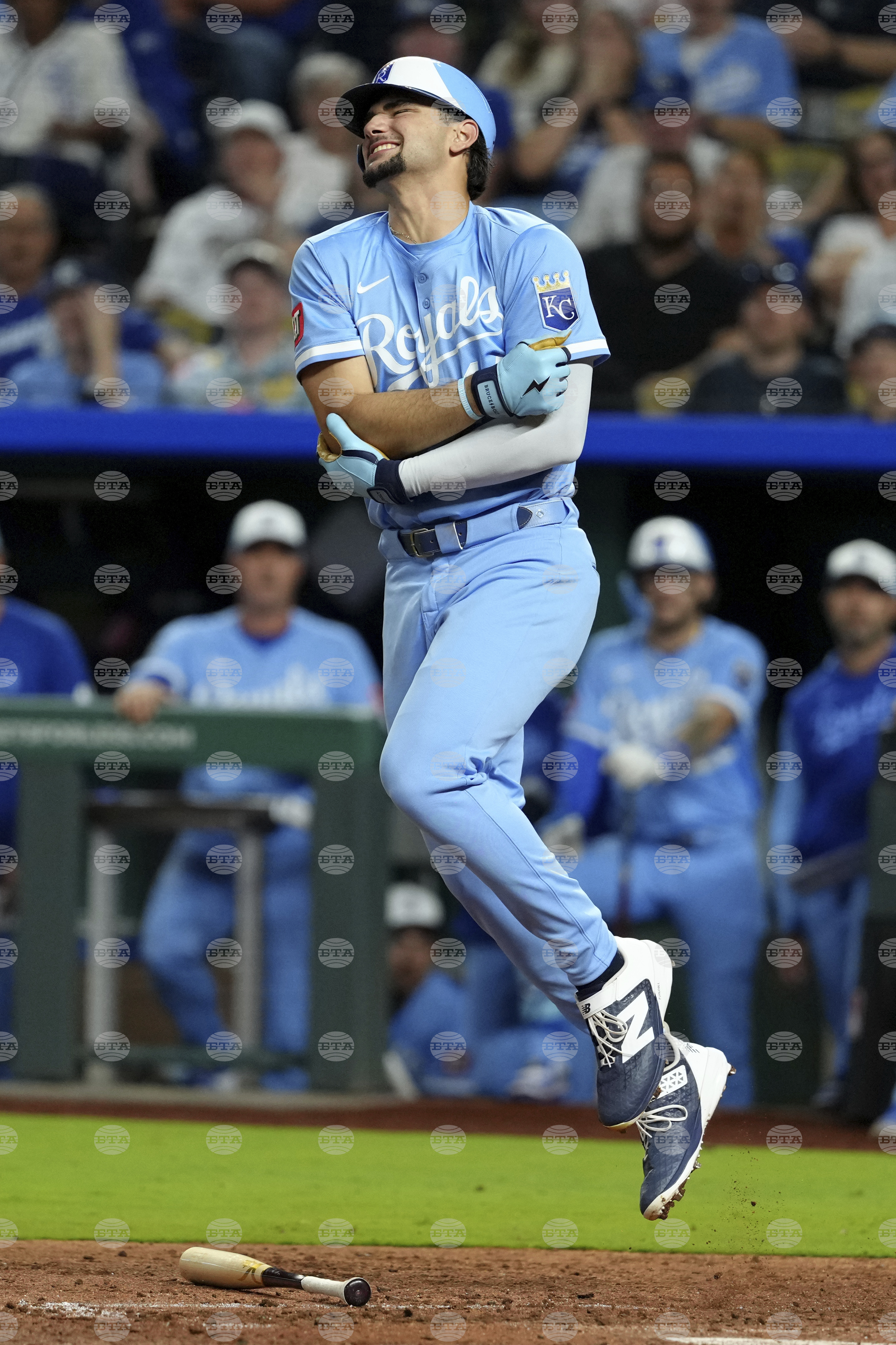 Kansas City Royals' Vinnie Pasquantino hits a home run in the fourth inning during a baseball game against the Toronto Blue Jays, Saturday Sept. 20, 2025, in Kansas City, Mo. (AP Photo/Ed Zurga)