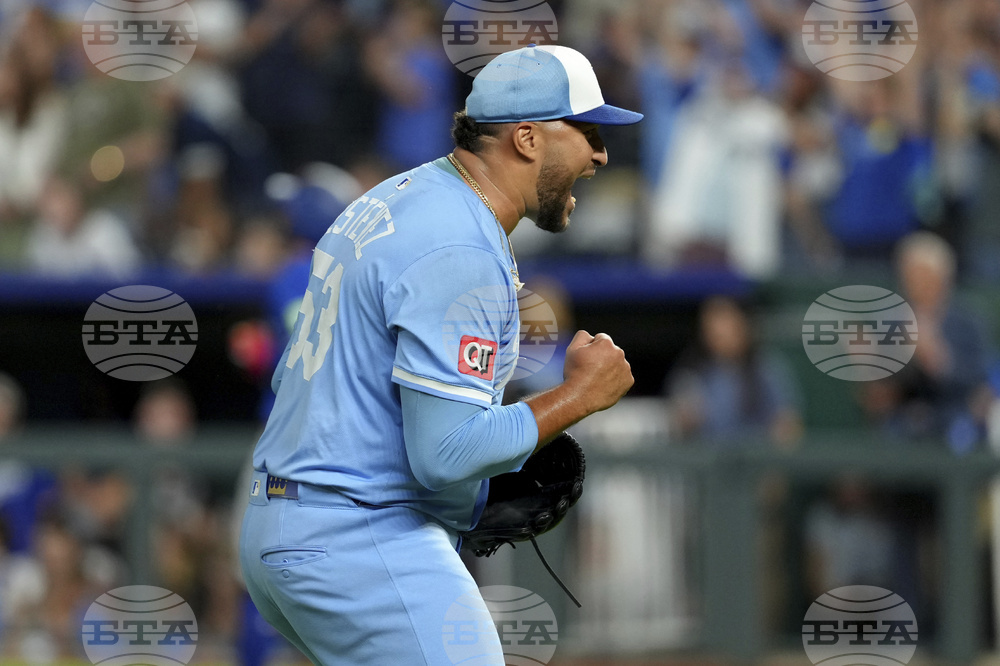 Kansas City Royals relief pitcher Carlos Estevez celebrates after a win over the Toronto Blue Jays in a baseball game Saturday Sept. 20, 2025, in Kansas City, Mo. (AP Photo/Ed Zurga)