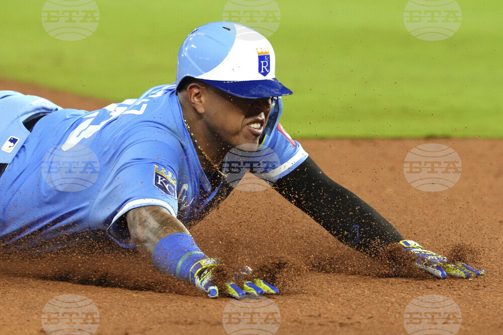 Kansas City Royals' Salvador Perez slides into third as he advances against the Toronto Blue Jays during the seventh inning of a baseball game Saturday Sept. 20, 2025, in Kansas City, Mo. (AP Photo/Ed Zurga)