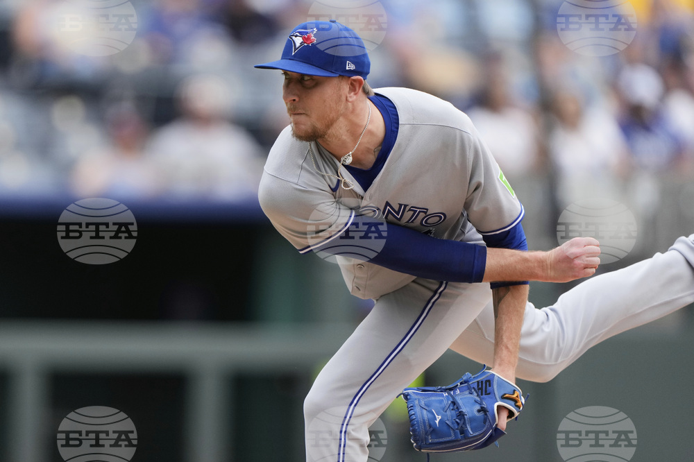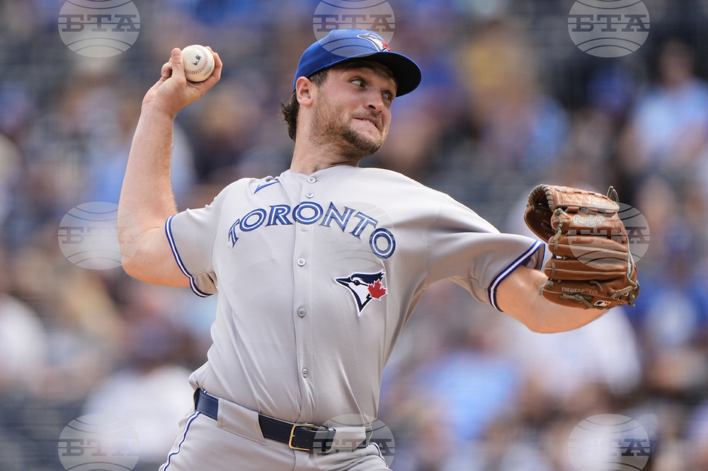 Toronto Blue Jays relief pitcher Jeff Hoffman throws during the ninth inning of a baseball game against the Kansas City Royals, Sunday, Sept. 21, 2025, in Kansas City, Mo. (AP Photo/Charlie Riedel)