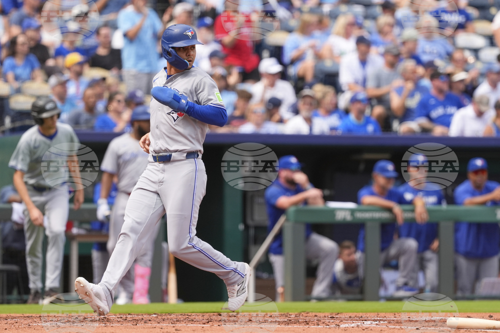 Toronto Blue Jays' Andres Gimenez runs home to score on a double by George Springer during the second inning of a baseball game against the Kansas City Royals, Sunday, Sept. 21, 2025, in Kansas City, Mo. (AP Photo/Charlie Riedel)