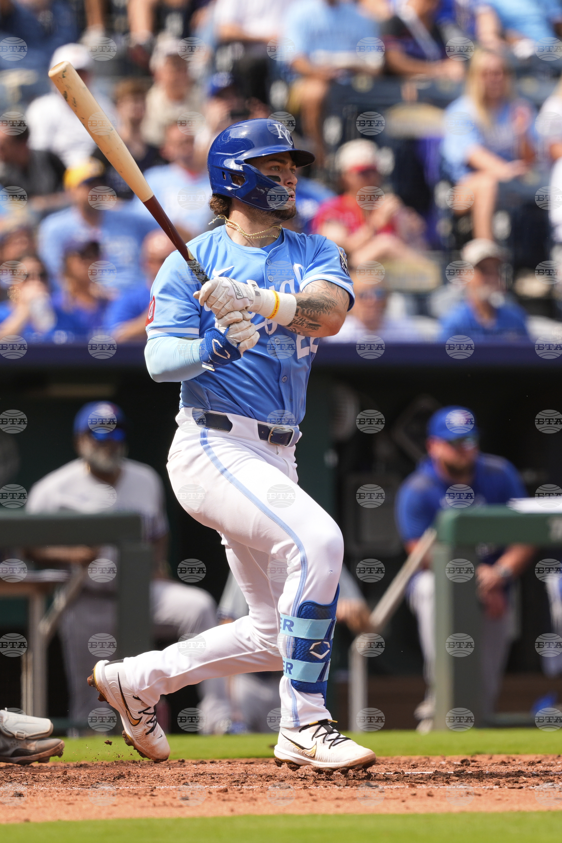 Kansas City Royals' Carter Jensen watches his two-run single during the fourth inning of a baseball game against the Toronto Blue Jays, Sunday, Sept. 21, 2025, in Kansas City, Mo. (AP Photo/Charlie Riedel)