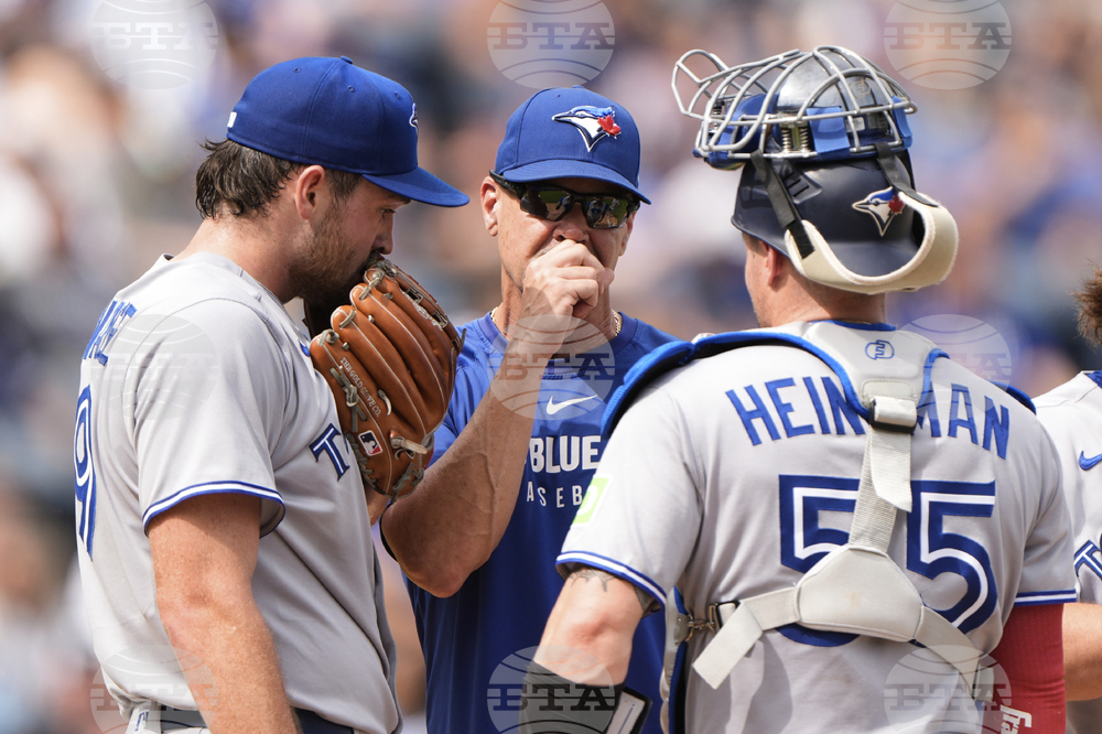 Toronto Blue Jays pitching coach Pete Walker talks to catcher Tyler Heineman (55) and starting pitcher Trey Yesavage during the fourth inning of a baseball game against the Kansas City Royals, Sunday, Sept. 21, 2025, in Kansas City, Mo. (AP Photo/Charlie Riedel)