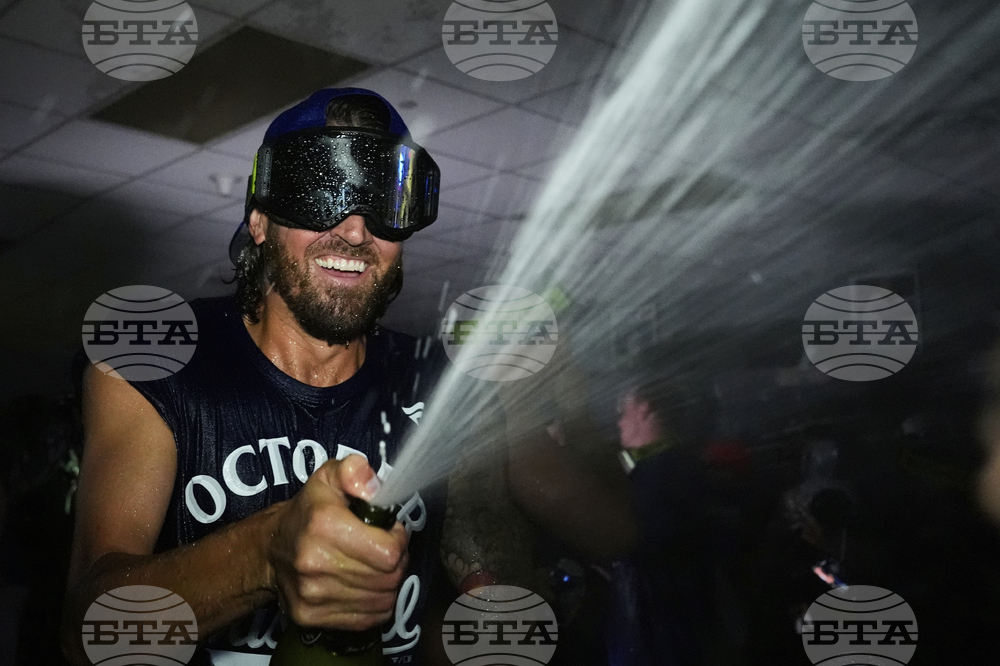 Toronto Blue Jays' Kevin Gausman celebrates with teammates in the clubhouse after their baseball game against the Kansas City Royals, Sunday, Sept. 21, 2025, in Kansas City, Mo. (AP Photo/Charlie Riedel)