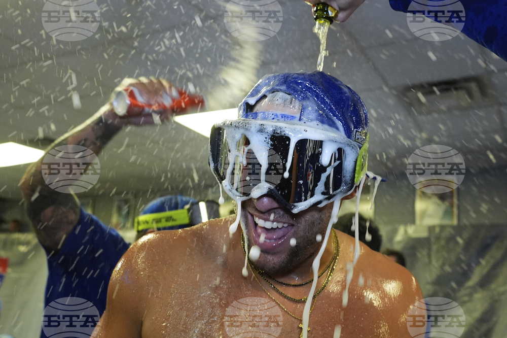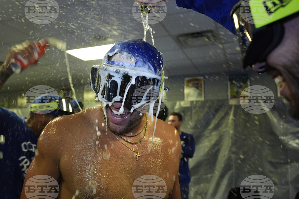 Toronto Blue Jays' George Springer celebrates with teammates in the clubhouse after their baseball game against the Kansas City Royals, Sunday, Sept. 21, 2025, in Kansas City, Mo. (AP Photo/Charlie Riedel)