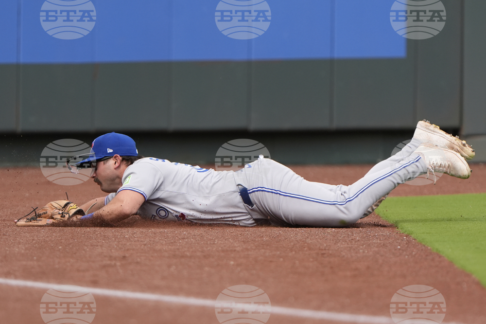 Toronto Blue Jays left fielder Davis Schneider dives after a triple hit by Kansas City Royals' Jac Caglianone during the sixth inning of a baseball game Sunday, Sept. 21, 2025, in Kansas City, Mo. (AP Photo/Charlie Riedel)