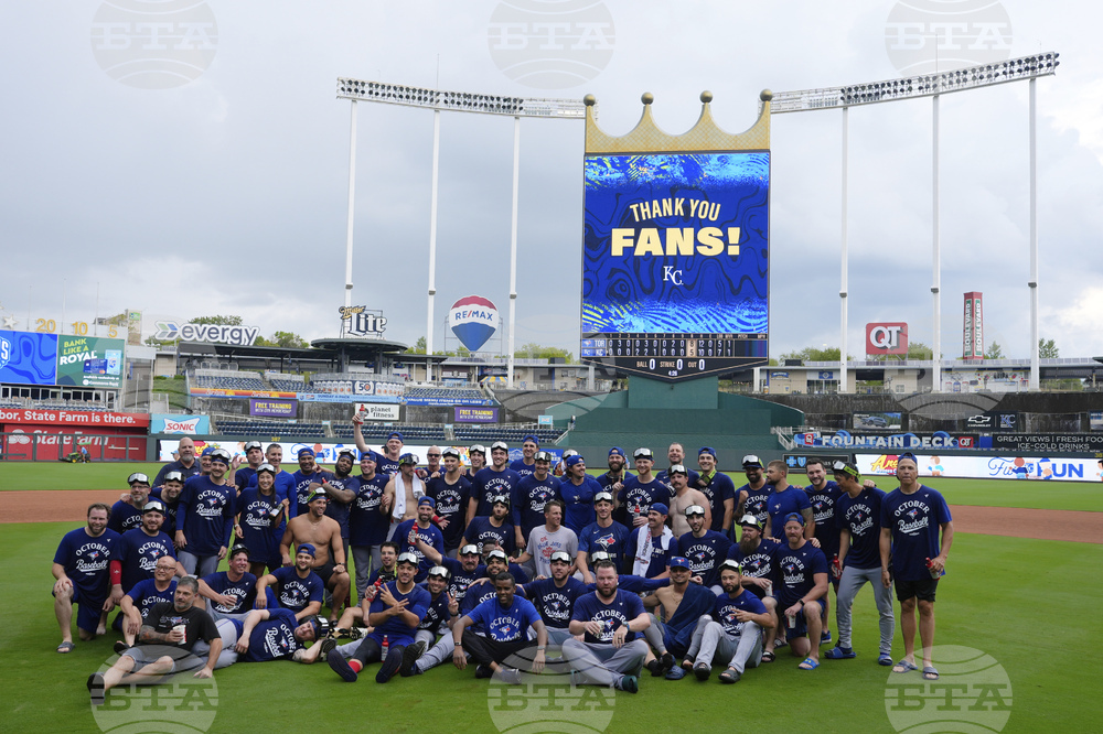 The Toronto Blue Jays pulse for a photo on the field after winning a baseball game against the Kansas City Royals to clinch a playoff spot Sunday, Sept. 21, 2025, in Kansas City, Mo. (AP Photo/Charlie Riedel)