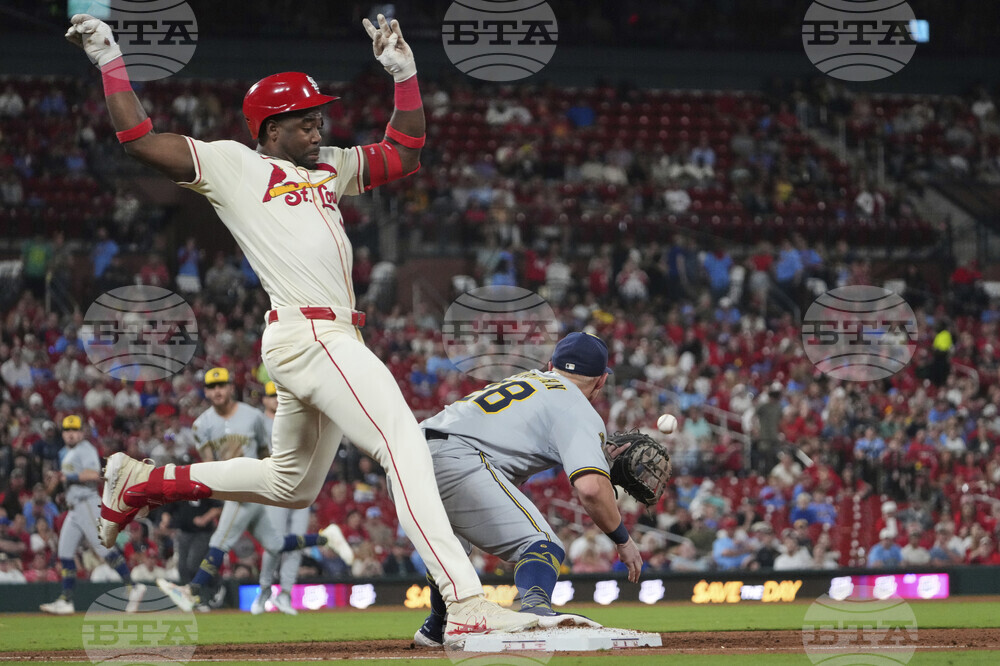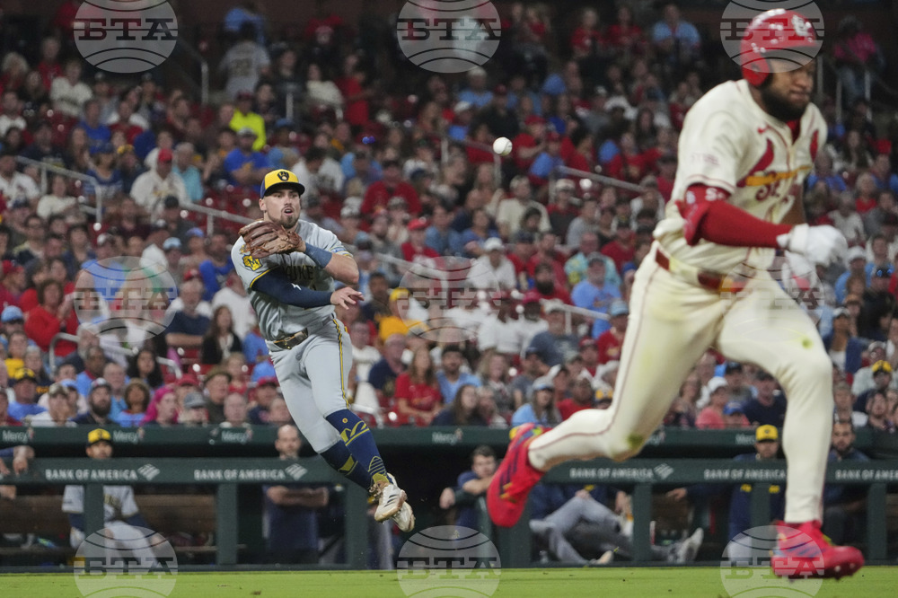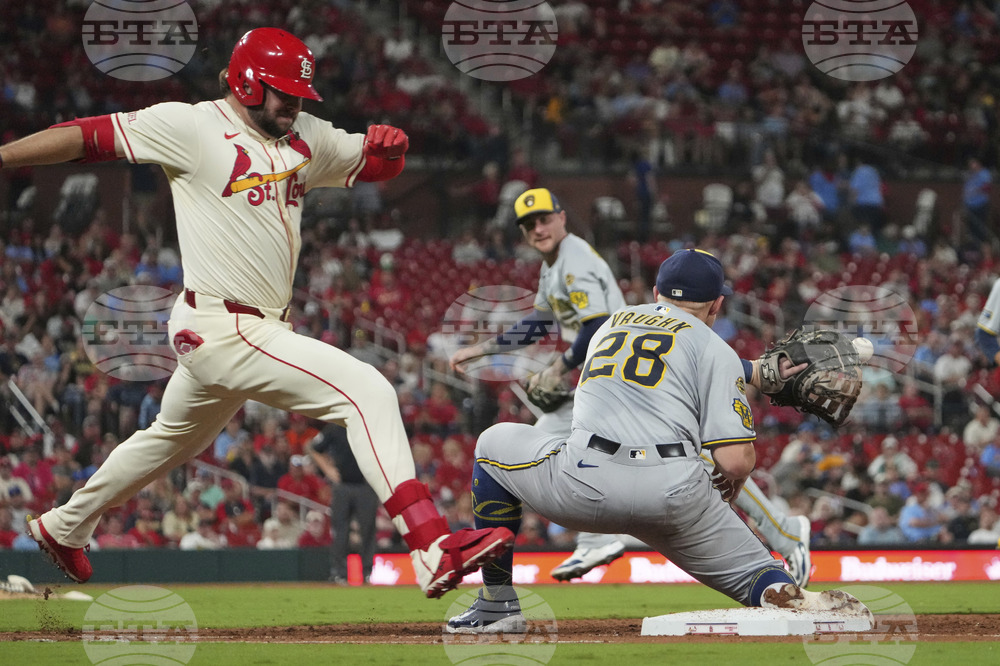 St. Louis Cardinals' Alec Burleson, left, is thrown out by Milwaukee Brewers second baseman Brice Turang, center, as Brewers first baseman Andrew Vaughn (28) handles the throw during the sixth inning of a baseball game Saturday, Sept. 20, 2025, in St. Louis. (AP Photo/Jeff Roberson)