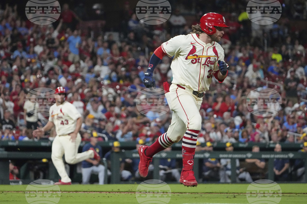 St. Louis Cardinals' Brendan Donovan, right, heads to first for an RBI single as teammate Pedro Pages jogs in to score during the fifth inning of a baseball game against the Milwaukee Brewers Saturday, Sept. 20, 2025, in St. Louis. (AP Photo/Jeff Roberson)