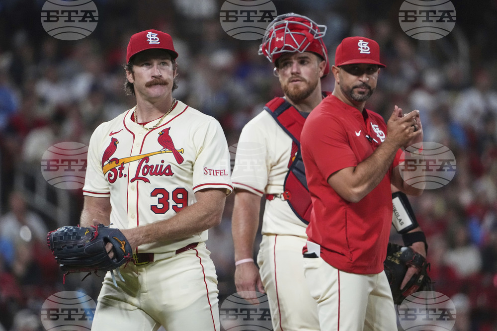 St. Louis Cardinals' Miles Mikolas (39) is removed by manager Oliver Marmol, right, as catcher Pedro Pages watches during the sixth inning of a baseball game against the Milwaukee Brewers Saturday, Sept. 20, 2025, in St. Louis. (AP Photo/Jeff Roberson)