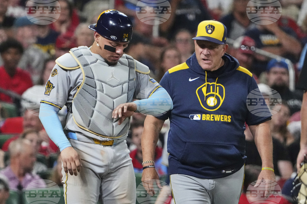 Milwaukee Brewers catcher William Contreras (24) leaves a baseball game against the St. Louis Cardinals during the eighth inning as manager Pat Murphy, center, and a trainer walk behind Saturday, Sept. 20, 2025, in St. Louis. (AP Photo/Jeff Roberson)