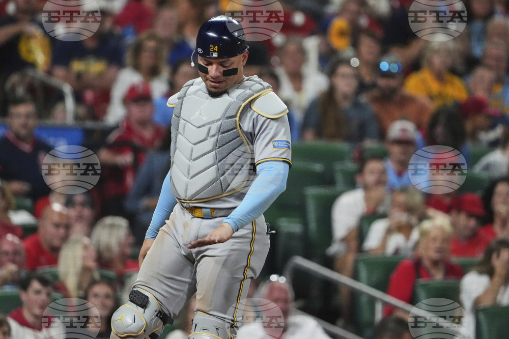 Milwaukee Brewers catcher William Contreras, left, throws his mask after injuring his hand during the seventh inning of a baseball game against the St. Louis Cardinals Saturday, Sept. 20, 2025, in St. Louis. (AP Photo/Jeff Roberson)