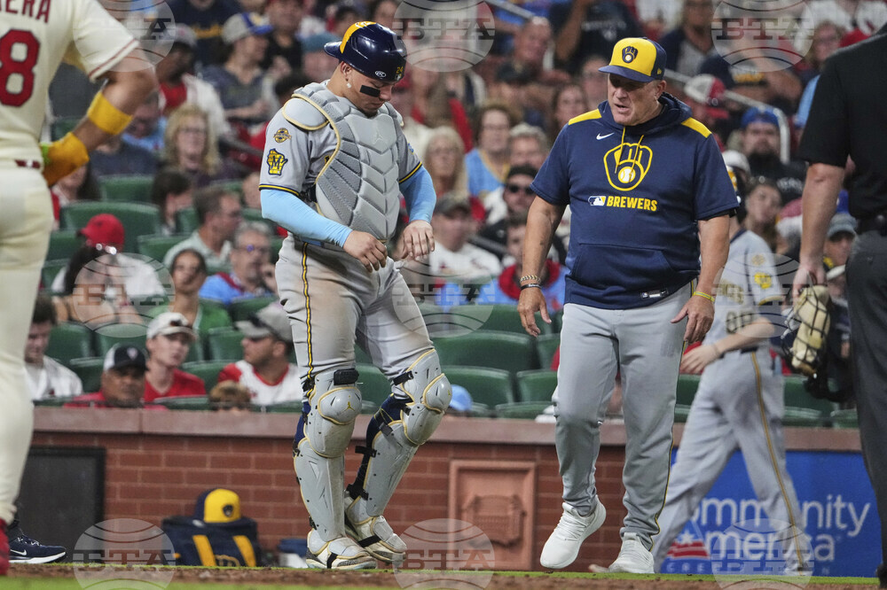 Milwaukee Brewers catcher William Contreras, left, looks down at his hand after being injured as manager Pat Murphy looks on during the seventh inning of a baseball game against the St. Louis Cardinals Saturday, Sept. 20, 2025, in St. Louis. (AP Photo/Jeff Roberson)