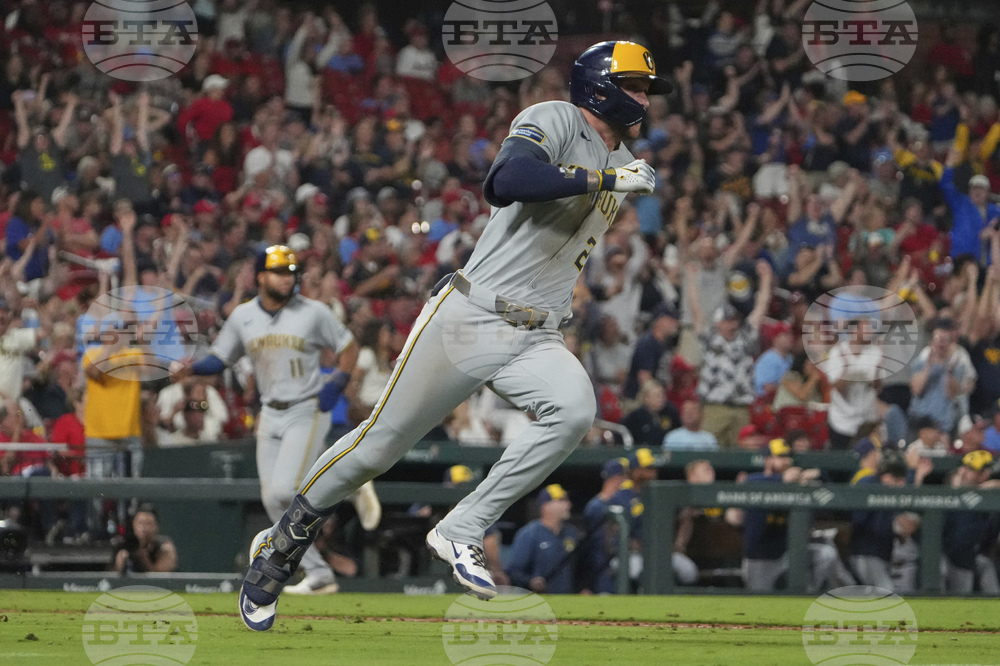 Milwaukee Brewers' Joey Ortiz, left, scores on a sacrifice fly hit by Jackson Chourio (not shown) during the fifth inning of a baseball game against the St. Louis Cardinals, Sunday, Sept. 21, 2025, in St. Louis. (AP Photo/Jeff Le)