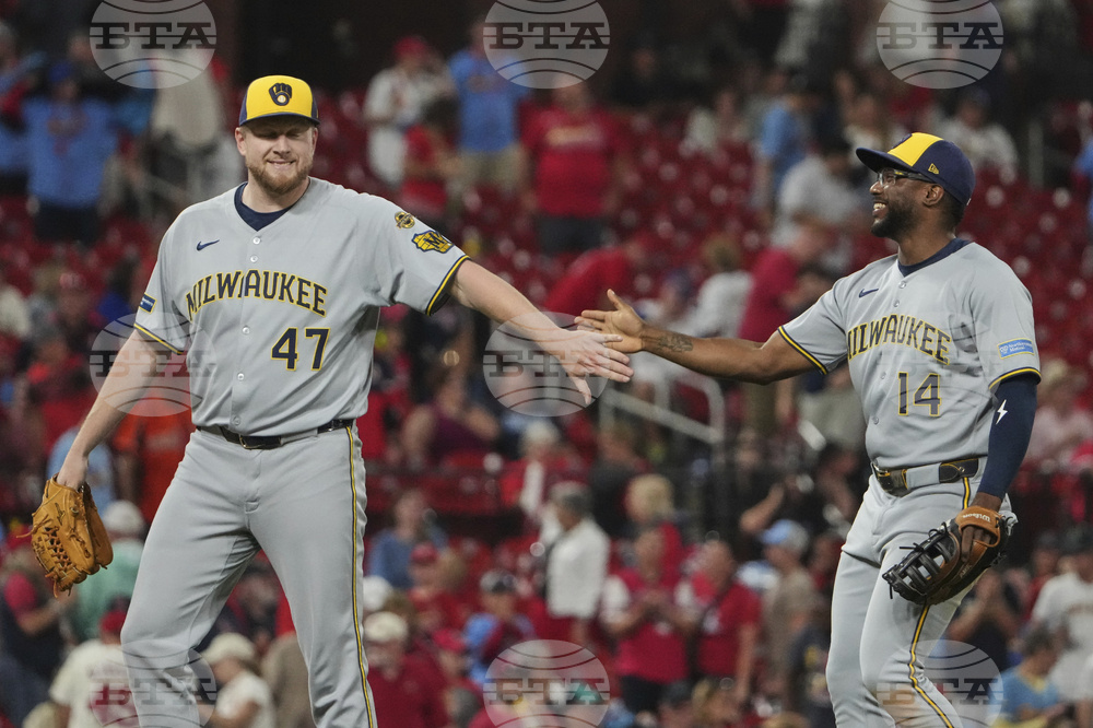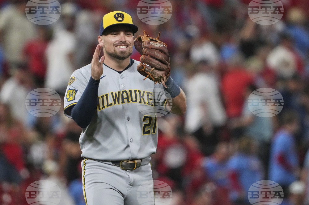 Milwaukee Brewers relief pitcher Bruce Zimmermann throws against the Milwaukee Brewers during the ninth inning of a baseball game Sunday, Sept. 21, 2025, in St. Louis. (AP Photo/Jeff Le)