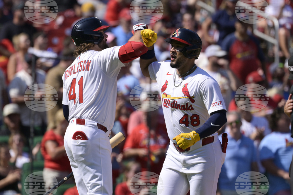St. Louis Cardinals' Ivan Herrera (48) reacts with Alec Burleson (41) after hitting a two-run home run against the Milwaukee Brewers during the third inning of a baseball game Sunday, Sept. 21, 2025, in St. Louis. (AP Photo/Jeff Le)