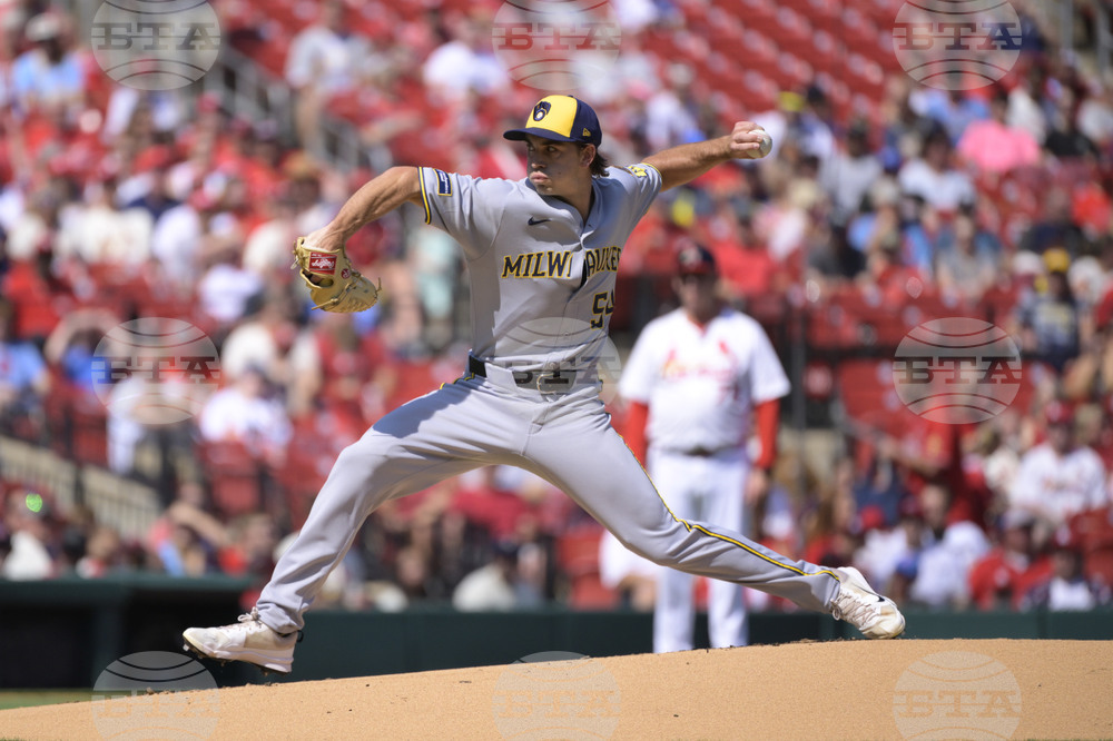 Milwaukee Brewers starting pitcher Robert Gasser throws against the St. Louis Cardinals during the first inning of a baseball game Sunday, Sept. 21, 2025, in St. Louis. (AP Photo/Jeff Le)