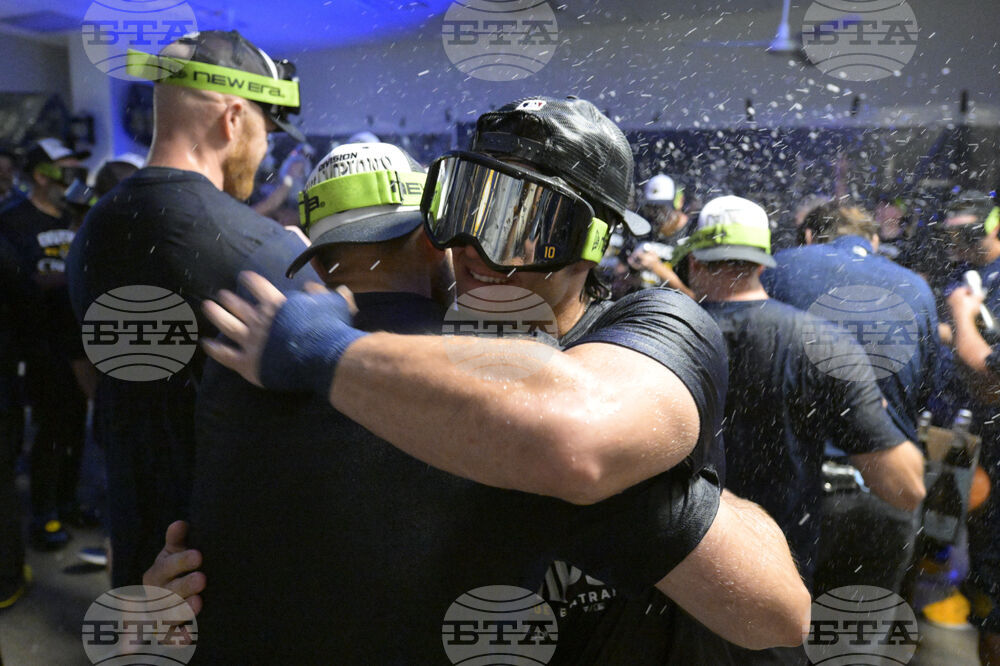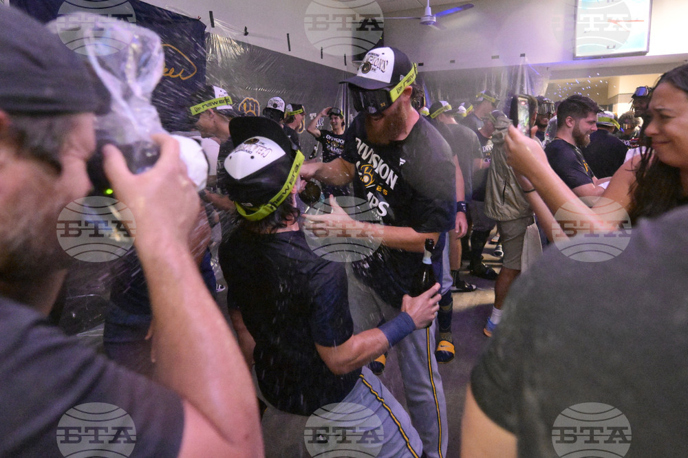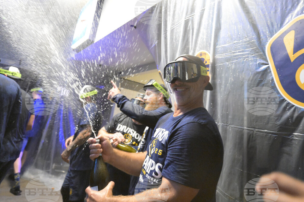 Milwaukee Brewers starting pitcher Brandon Woodruff (53) celebrates with teammates after clinching the Central Division Sunday, Sept. 21, 2025, in St. Louis. (AP Photo/Jeff Le)